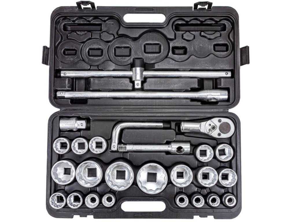 Sada obsahuje 26 dielov . Všetky hlavice a redukcie sú umiestnené v praktickom plastovom kufríku , ktorý zaručuje bezpečný transport bez možnosti samovoľného otvorenia.
