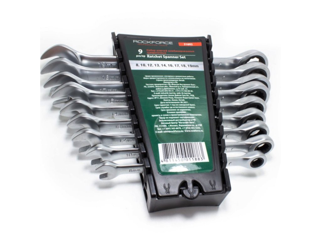Súprava očkoplochých kľúčov značky Rockforce . Vyrobené z ocele CrV , podľa normy DIN 3110. Hlavy kľúčov leštené.