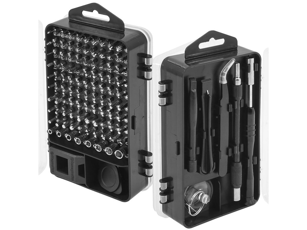 Súprava 110 precíznych nástrojov, bitov a otváračov s ľahkým hliníkovým držadlom je určená pre precízne servisné opravy telefónov a smartfónov aj všetky spotrebné elektroniky.
