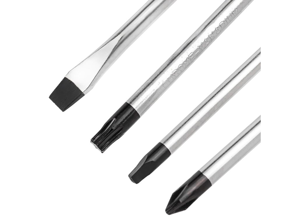 - 8 plochých skrutkovačov: 8×150 / 6×150 / 6×100 / 5×125 / 5×100 / 5×75 / 4×100 / 3×75 mm