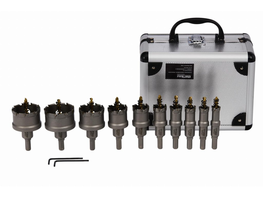 Profesionálna sada vykružovacích vrtákov z tvrdokovu značky Kraft&Dele , model KD10061 , určená na vyrezanie presných otvorov v kovových plochách. Vhodná pre prístroje umožňujúce výmenu pracovnej koncovky, ako sú vŕtačky alebo brúsky.