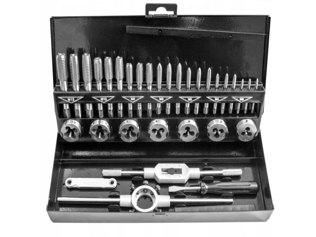 Pre inštalačné práce, autoservisy, strojárenské prevádzky a zámočnícke dielne. Súprava slúži na opravy závitových spojov rôznych rozmerov.