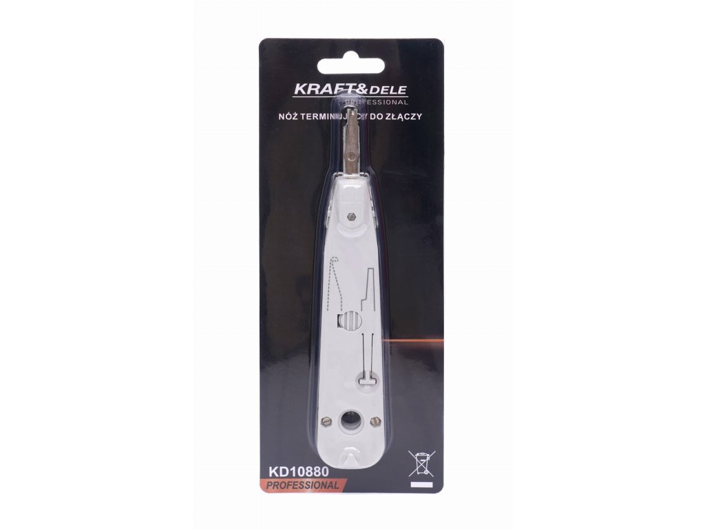 Terminovací nôž na konektory značky Kraft&Dele , model KD10880 , umožňuje pohodlné zakončovanie káblov napríklad v telefónnych zásuvkách, telekomunikačných (RJ45) konektoroch a patch paneloch. Automaticky odreže prebytočný kábel (UTP, FTP, DRÔT, LANKO atď.). V rukoväti noža sú pohodlné úchyty na vybratie zle zasunutého vodiča.
