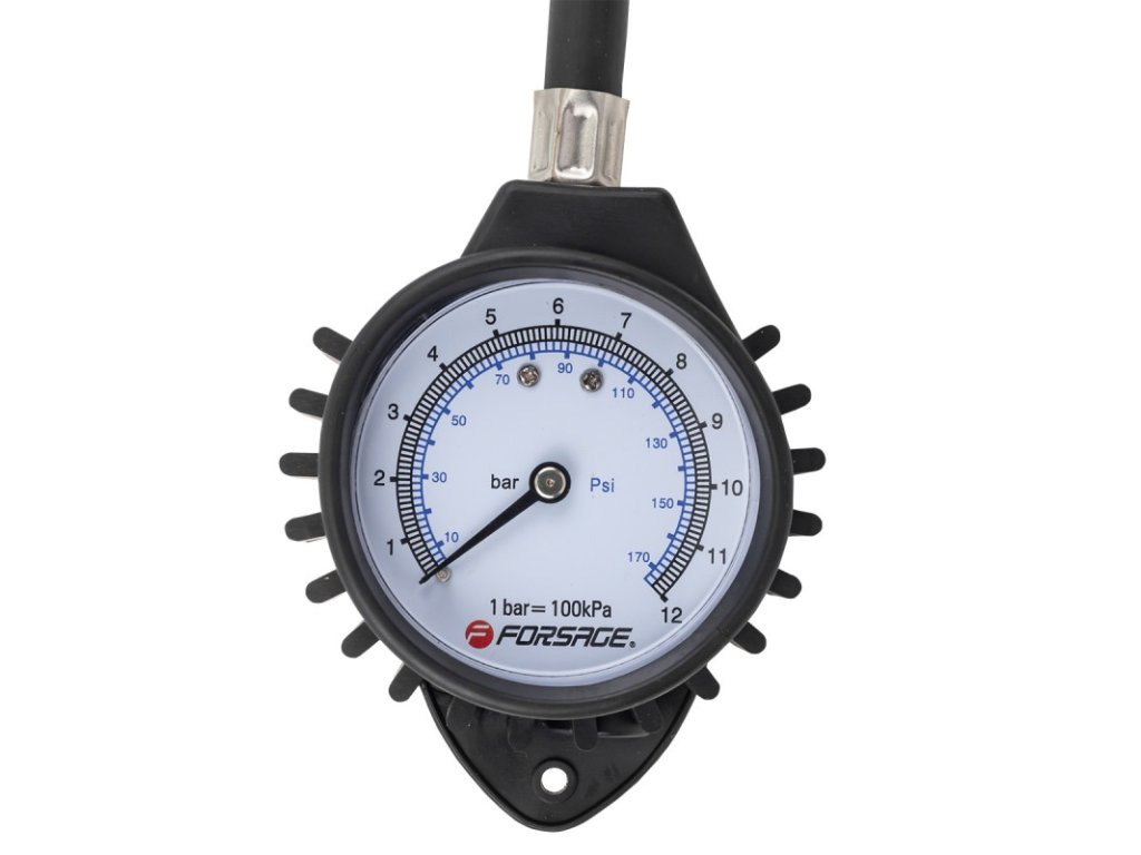 Ukazovateľ tlaku má merací rozsah od 0 do 12 barov, čo umožňuje presné meranie tlaku pri rôznych typoch pneumatík, od bicyklov až po automobilové či nákladné pneumatiky.