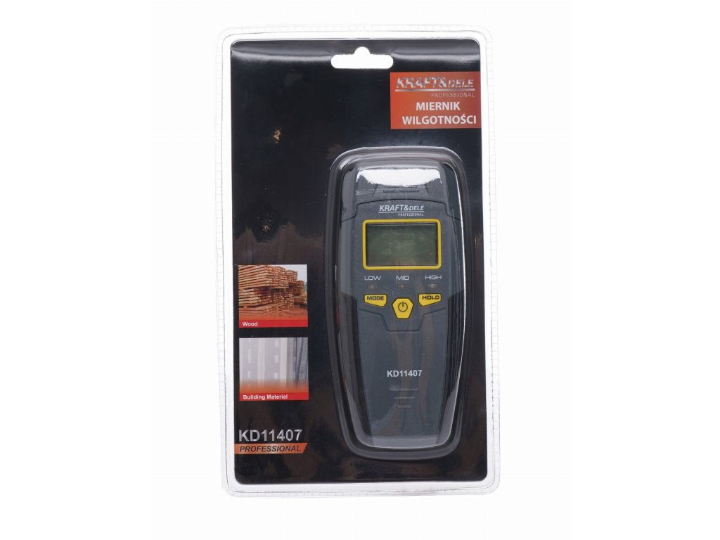 Merač vlhkosti KD11407 značky Kraft&Dele meria obsah vlhkosti detekciou elektrického odporu cieľového materiálu pomocou dvoch hrotov. Zariadenie má inteligentnú jednodeskovú konštrukciu s nízkou spotrebou energie, obsah vlhkosti sa zobrazuje na LCD displeji.