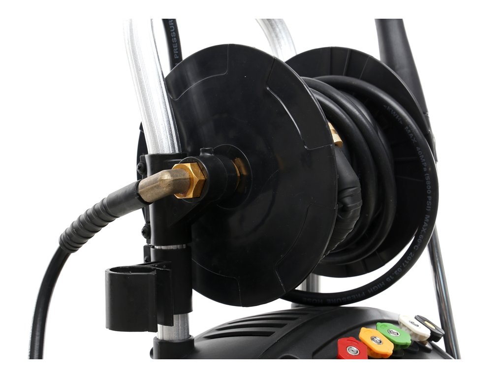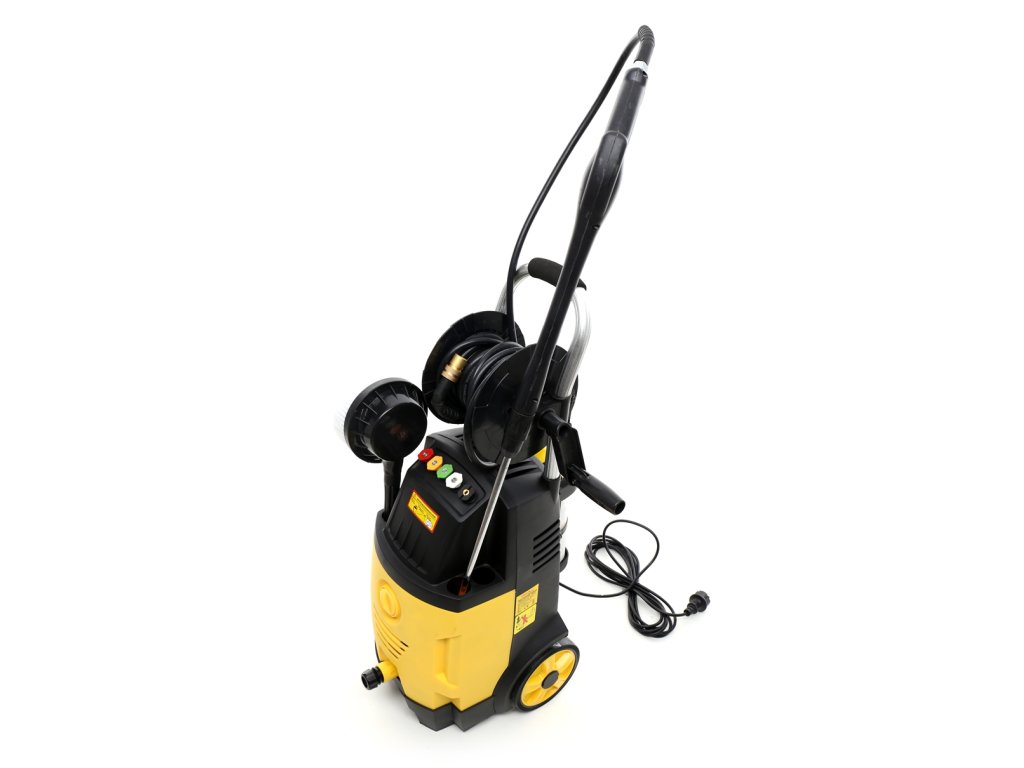 Vďaka systému AUTO-STOP sa čistič automaticky vypne pri uvoľnení spúšte pištole, čím šetrí energiu, vodu a predlžuje životnosť čerpadla. Integrovaný navijak na hadicu a veľké kolesá uľahčujú manipuláciu a skladovanie, zatiaľ čo zabudovaná nádržka na čistiaci prostriedok umožňuje jednoduchú aplikáciu detergentov.