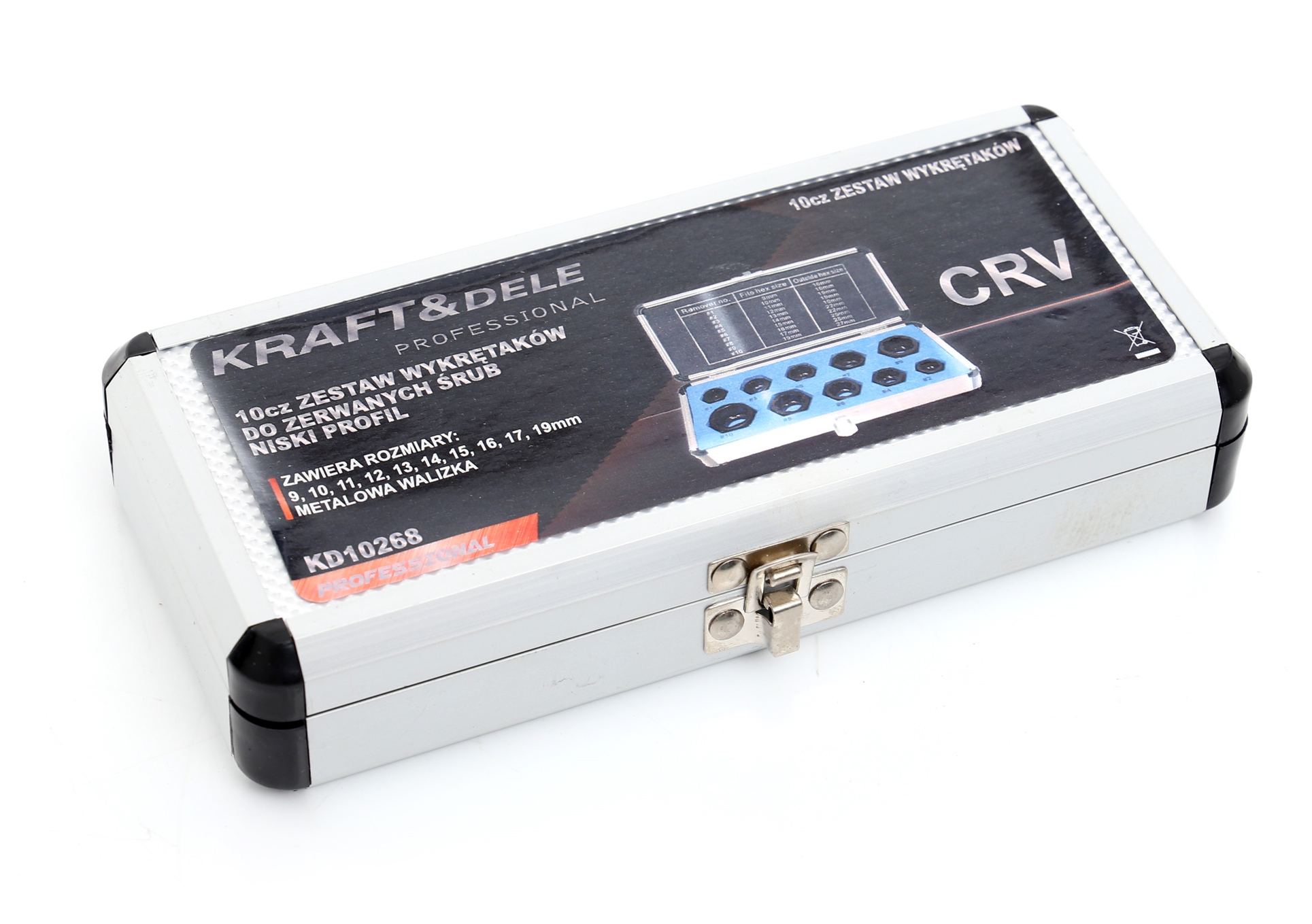 Sada obsahuje vyťahovače v 10 veľkostiach: 9, 10, 11, 12, 13, 14, 15, 16, 17 a 19 mm.
