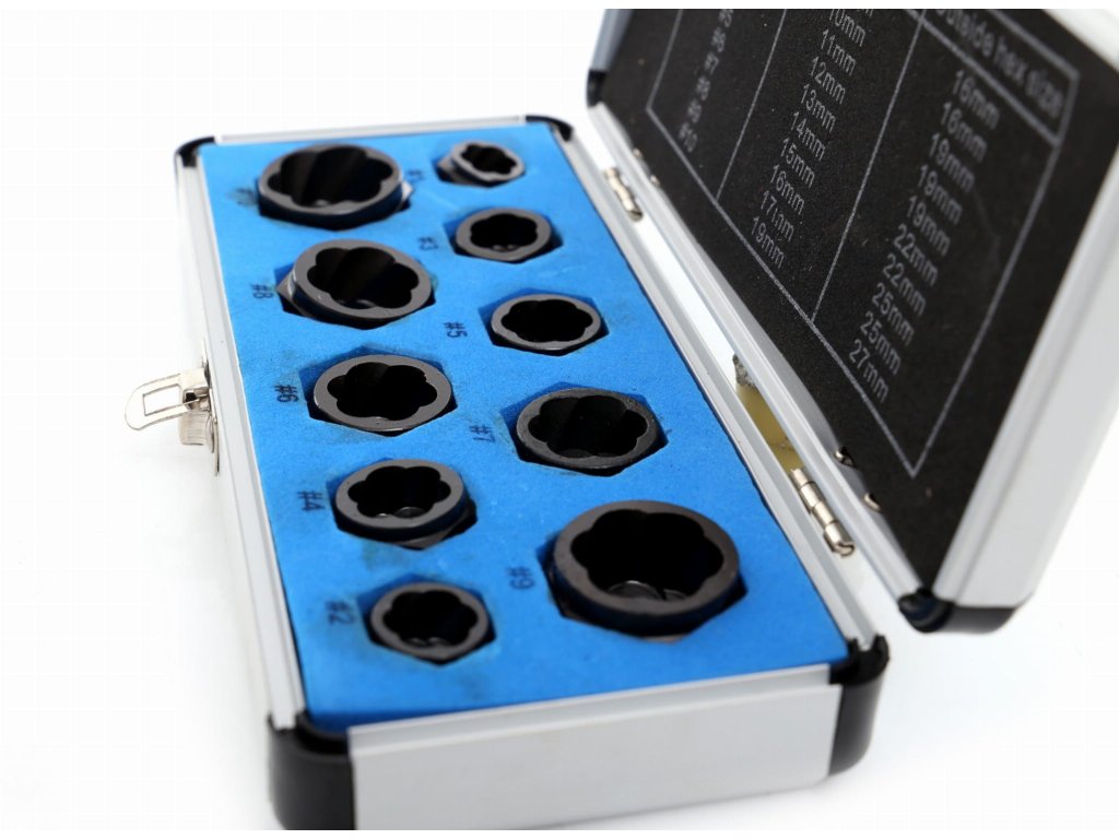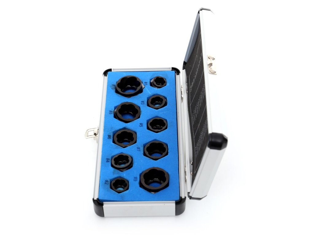 Sada obsahuje vyťahovače v 10 veľkostiach: 9, 10, 11, 12, 13, 14, 15, 16, 17 a 19 mm.