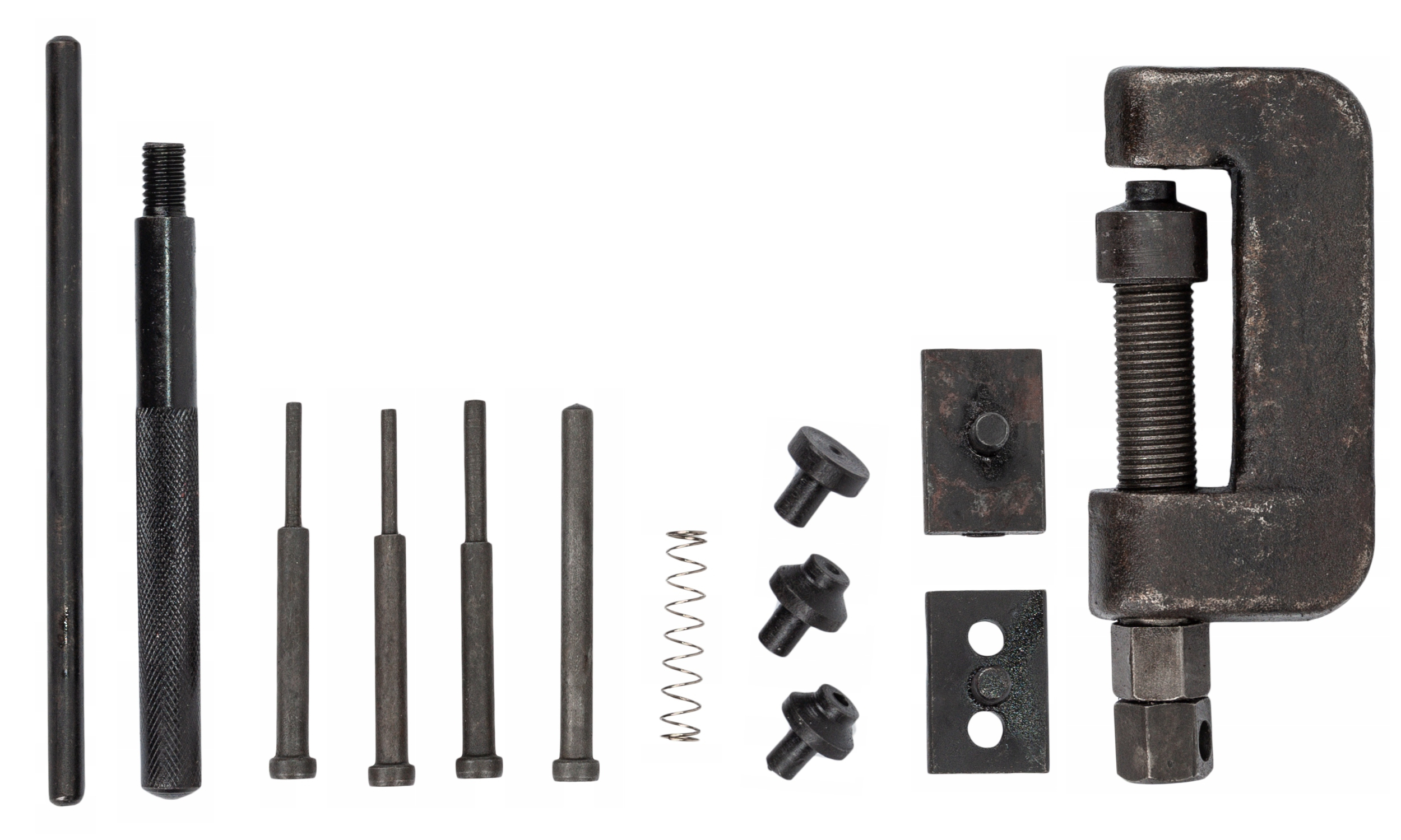 Jednoduchá na použitie nýtovačka na nitovanie a demontáž hnacích reťazí. Sada obsahuje 3 čapy pre nitovanie a demontáž reťazí, čap na lisovanie nýtov s lisom, pružinu a nevyhnutné koncovky.