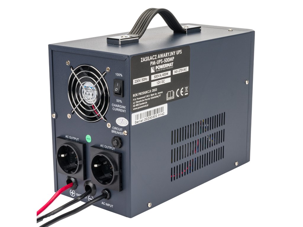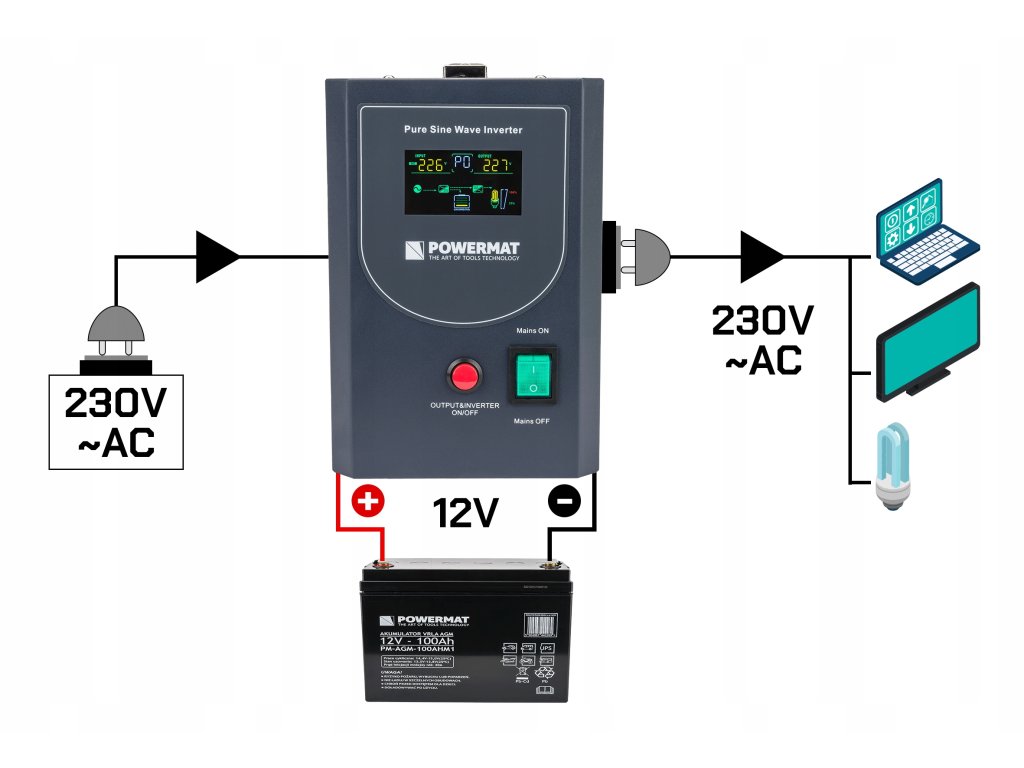 - Záložný zdroj UPS značky POWERMAT ponúka skvelé riešenie pre tento problém. Umožňuje pripojenie externých batérií alebo súprav batérií (paralelne) s napätím 12V a má dva výstupné konektory s napätím 230V, čo umožňuje napájanie dvoch zariadení súčasne.