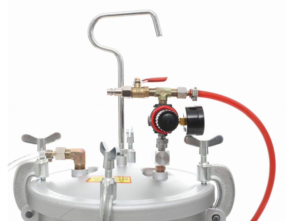 Sada obsahuje 8 l nádrž vyrobenú z hliníka, na jej veku je namontovaný regulátor tlaku s manometrom a bezpečnostným ventilom. Farba je do lakovacej pištole privádzaná pod tlakom a tu je rozprašovaná pomocou stlačeného vzduchu. Tlakový maliarsky agregát je ideálny na maľovanie veľkých plôch a nielen to.