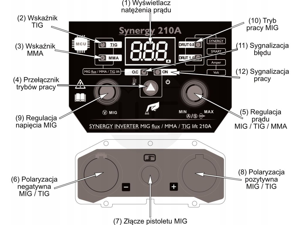 - Synergie 210A: Automaticky volí parametre podľa zvoleného zváracieho postupu.